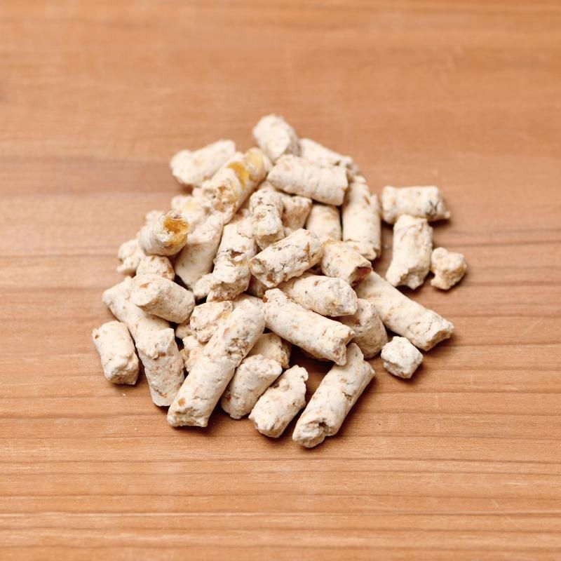 国産ふじりんごの果肉と、じっくりと焼き上げ甘さをたっぷり引き出した国産さつまいもをまぜまぜ。仕上げに角切りにしたさつまいもを加えギュッと固めることで歯触りも楽しいトリーツが完成しました。りんごやさつまいもに含まれる食物繊維が腸の健康維持をサポートします。