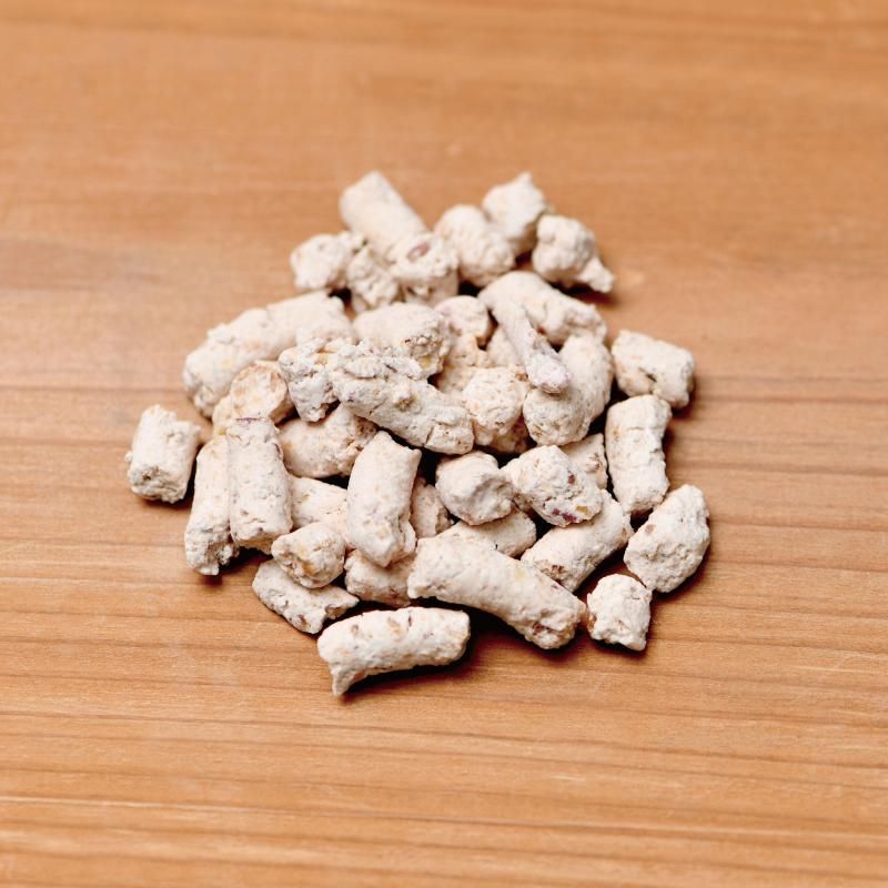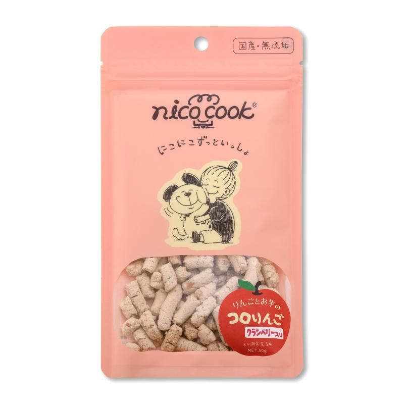 国産ふじりんごの果肉と、じっくりと焼き上げ甘さをたっぷり引き出した国産さつまいも、果肉たっぷりの無添加クランベリージュースをまぜまぜ。仕上げに角切りにしたさつまいもを加えギュッと固めることで歯触りも楽しいトリーツが完成しました。クランベリーに含まれる特有のポリフェノールやキナ酸が下部尿路の健康維持をサポートします。