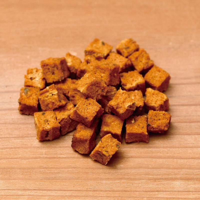 愛犬愛猫にとってたんぱく質と脂質のバランスに優れた食材である天然真鯛にカルシウム豊富な中骨を柔らかく煮込み練り込んだおさかなトリーツです。独自製法により特有のニオイを抑え、風味豊かで無添加のサックリした食感の真鯛キューブに仕上げました。真鯛に多く含まれると言われるアスパラギン酸が健康で元気な生活の維持をサポートします。