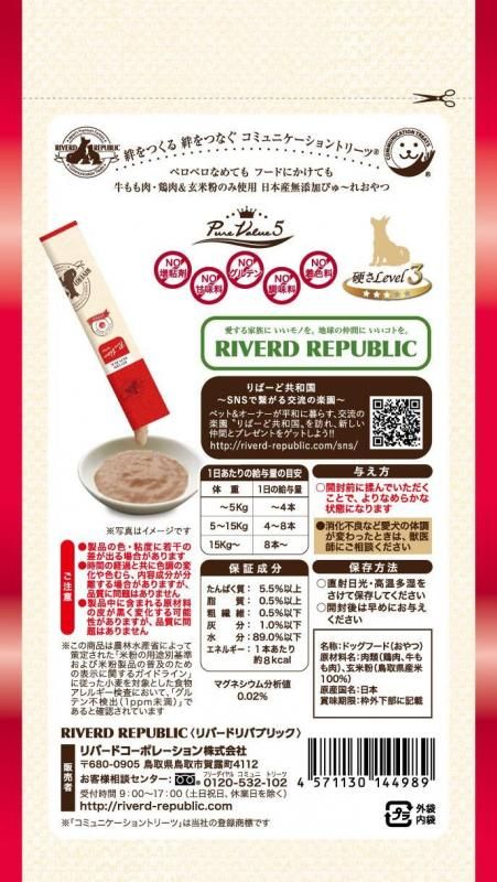 ペロペロなめても フードにかけても 牛もも肉・鶏肉&玄米粉のみ使用 日本産無添加ぴゅ〜れおやつ 自社工場から直送 絆をつくる 絆をつなぐ コミュニケーショントリーツ